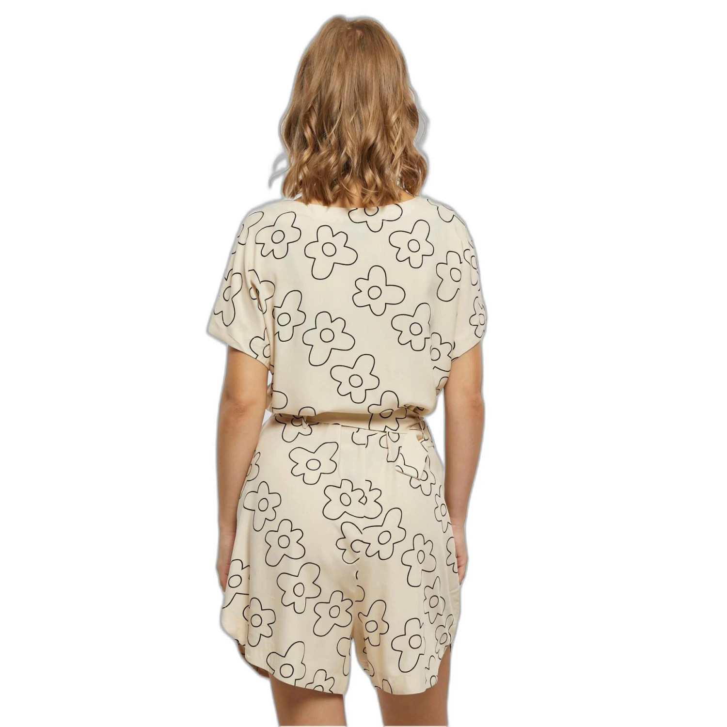 Deze vrouwelijke jumpsuit met losse pasvorm staat garant voor een authentiek zomergevoel. Het heeft een V-halslijn, ronde onderbenen en korte, schuine mouwen. Een extra riem met een grote metalen gesp geeft het pak zijn vorm. Er zijn twee zijkanten voor het opbergen van benodigdheden. De jumpsuit is gemaakt van gladde, geweven viscose en is heerlijk om te dragen.Shell Fabric 1: 100% viscose, geweven stof, 115 gsm.
